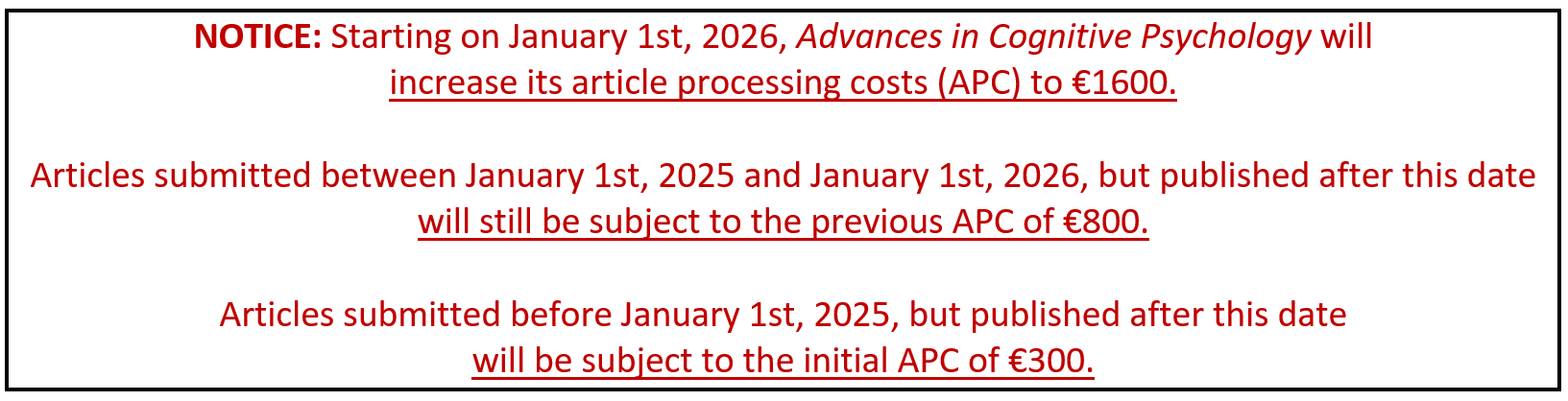 In 2022-2024, Advances in Cognitive Psychology receives financing from the Ministry of Science and Higher Education, Poland within the program Rozwój Czasopism Naukowych (application/contract no. RCN/SN/0494/2021/1; total value of the project: 91,908.00 PLN; funds granted directly by the Ministry: 45,954.00 PLN; date of signing the contract: 23.12.2022). The aim of the project is to improve the scientific and editorial standards of scientific journals as well as to increase their international impact and reach. The funds received as part of the program are used by Advances in Cognitive Psychology to (a) finance access to an editorial system software suite, including an anti-plagiarism tool, and to register DOI numbers for the published articles, (b) implement current best practices into the editorial workflow on the level of the editorial system suite, including the addition of ORCID numbers, (c) finance access to typesetting software, and (d) promote the journal among potential authors and readers online.